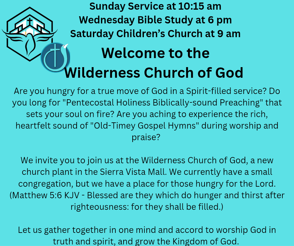 Wilderness Church of God is a place of worship and a beacon of hope and transformation. Our mission is to bring the Gospel to those trapped in their wilderness, echoing the words of Hosea 2:14, ‘Speaking tenderly.’ We are a Spirit-empowered church driven by a deep desire to speak tenderly to the lost, guiding them out of the darkness and into the light of Christ’s love and salvation!